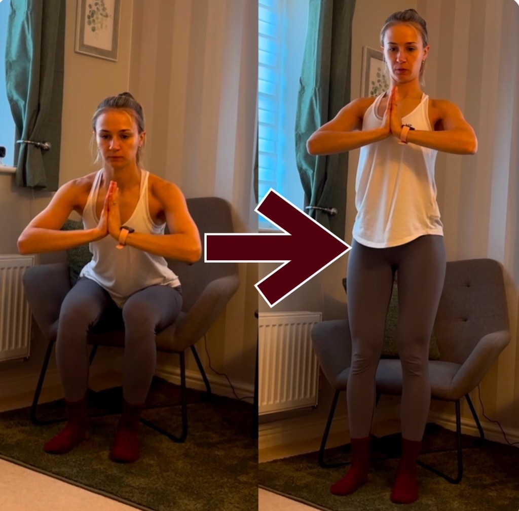 Sit to stand – inhale as you lower into the chair, exhale as you push to stand. Ensure the knees track out towards your little toes and don’t buckle in towards each other. You can also have your hands on your hips to help push you up to stand.