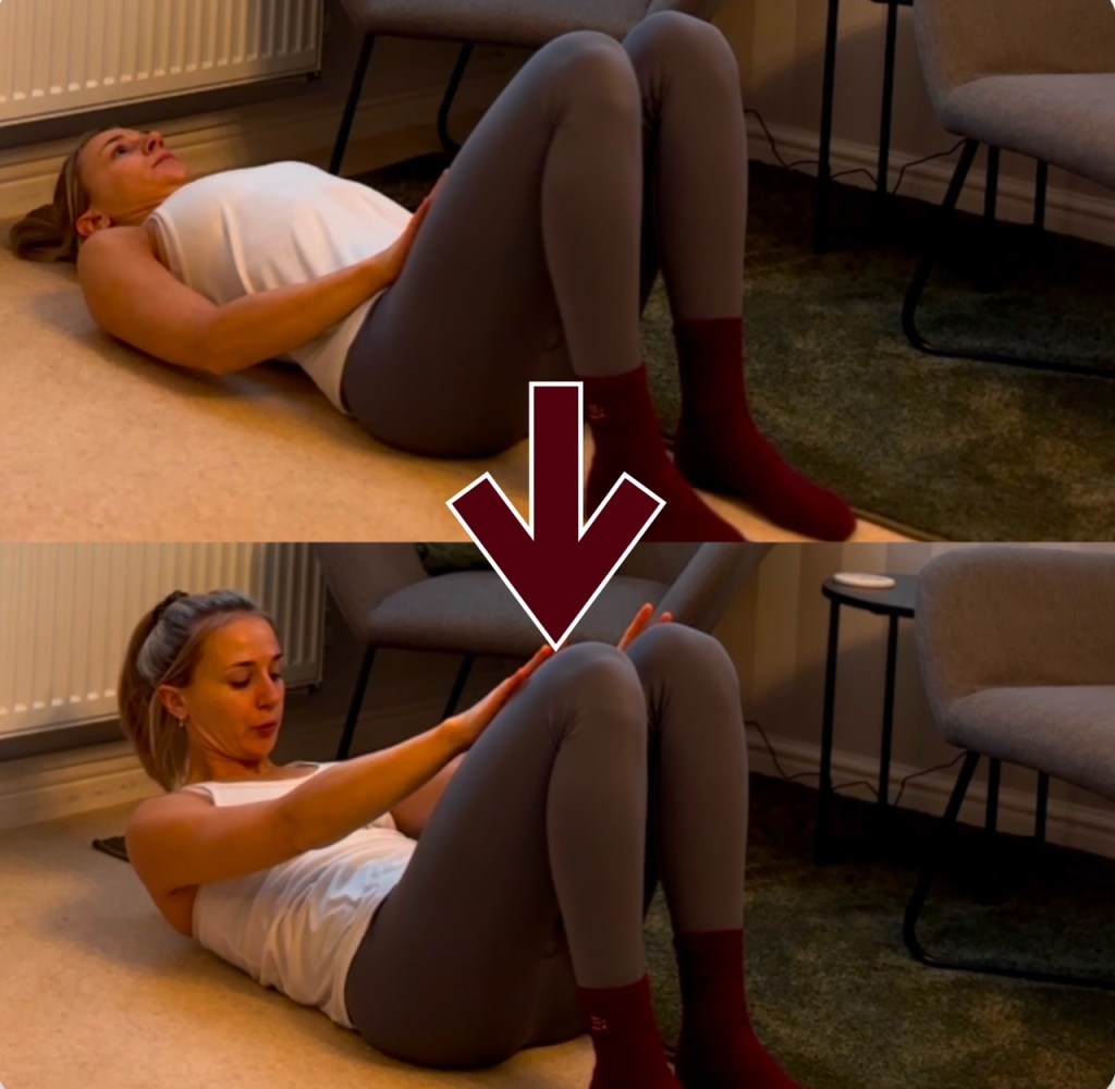 Ab prep – start with your hands at the base of your hips. Exhale as you gently squeeze the core, head and shoulders lift as the hands slide up the legs. Inhale as you gently lower back to the mat.